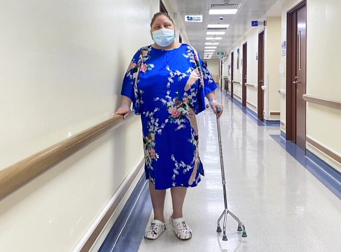 Bà Liudmila tập đi lại trước khi xuất viện. Ảnh: Bệnh viện Đa khoa Tâm Anh