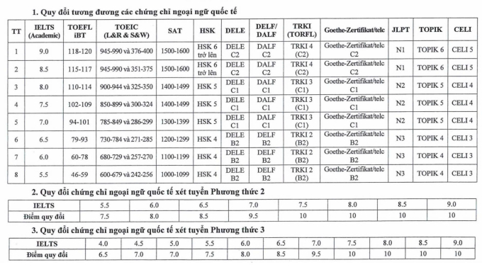 Trong đó,nếu xét tuyển bằng phương thức 2,thí sinh có chứng chỉ IELTS tương đương 5.5 trở lên được quy đổi thành 7,5-10/10 điểm.