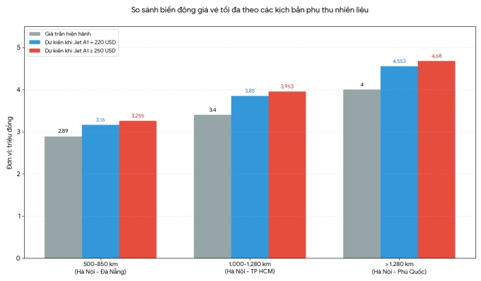Với giả định mức phụ thu nội địa từ 100.000 đến 250.000 đồng mỗi chiều,vé máy bay khứ hồi chặng Hà Nội - Đà Nẵng 3 ngày 2 đêm có thể tăng khoảng 200.000-500.000 đồng một khách. Nếu tính cả chi phí vận chuyển tại điểm đến do tác động từ giá xăng dầu,tổng ngân sách chuyến đi của khách lẻ có thể tăng thêm 300.000-700.000 đồng so với cùng kỳ năm ngoái,tùy thời điểm đặt vé và hạng dịch vụ.