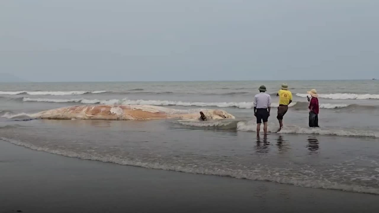 Xác cá voi đang trong quá trình phân hủy, dài gần 10 m, nặng hơn 5 tấn, dạt vào bờ biển xã Hải Châu, sáng 20/3.